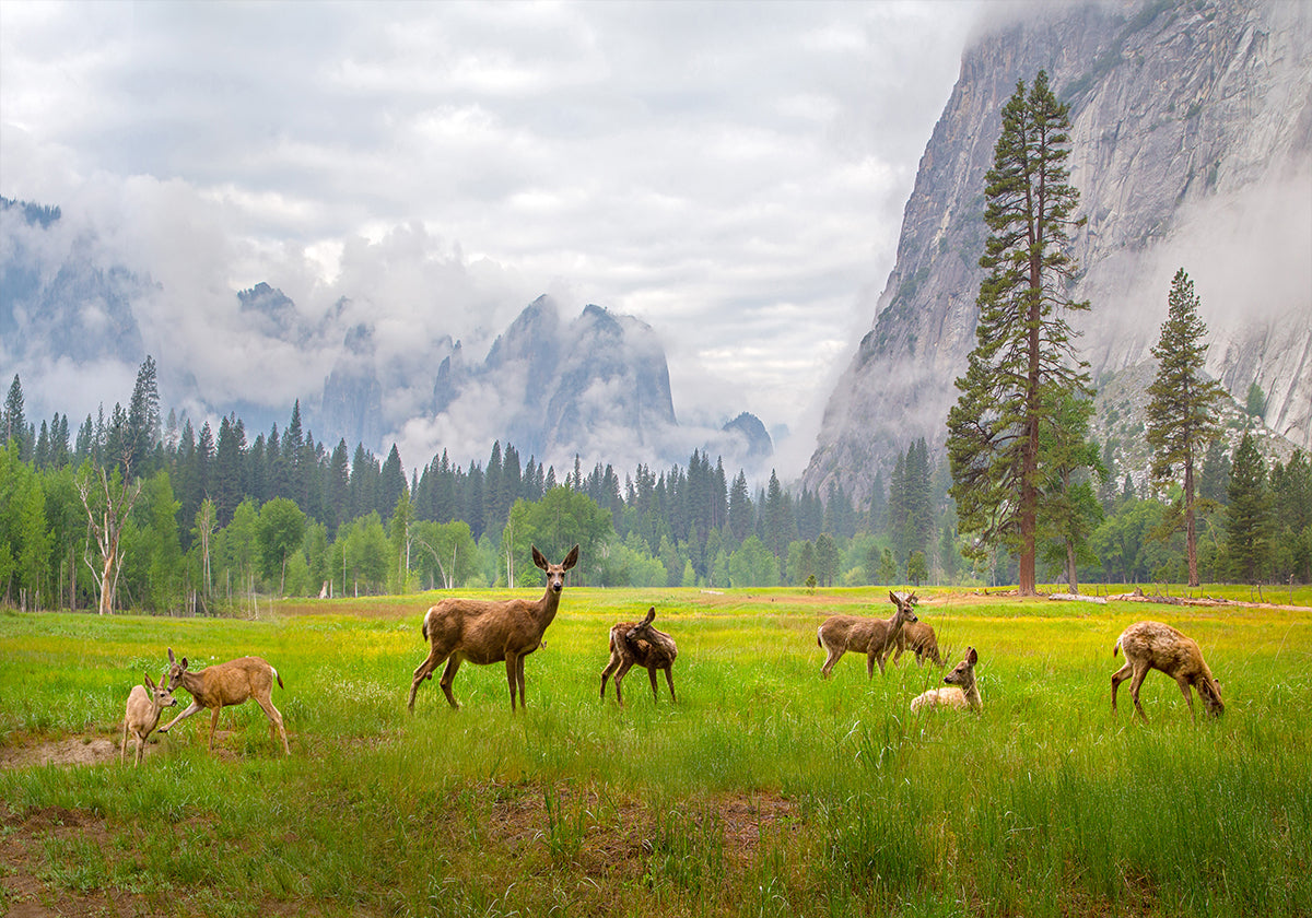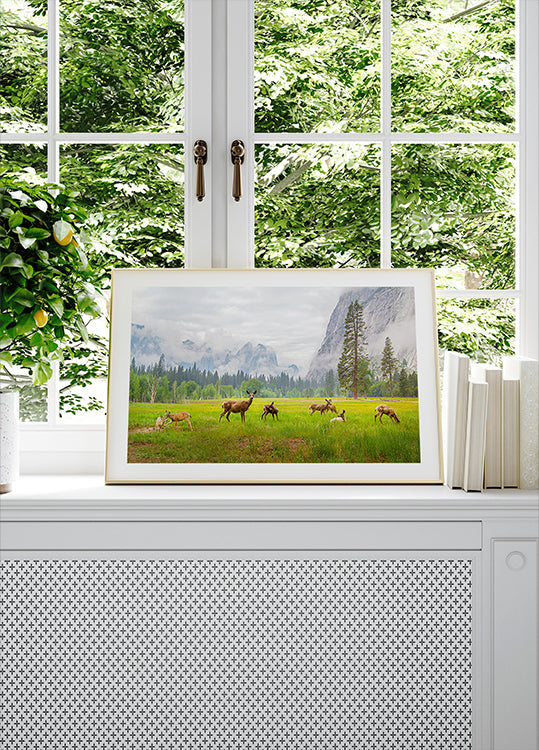 Les chevreuils dérivent dans une prairie brumeuse de Yosemite, leurs bois attrapant les premiers ors de l'aube tandis que d'imposants pins et des falaises lointaines s'élèvent comme des gardiens. Procession feutrée de la nature, cette scène évocatrice de Dianne Mao invite à une pause intemporelle, où la vallée, la forêt et le troupeau respirent une harmonie ancienne. Inspirez le calme.