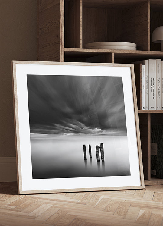 Time after Time de George Digalakis capture un paysage marin poétique en noir et blanc : des poteaux usés se dressent comme des signes rythmés dans l'eau calme et soyeuse, tandis que des nuages bas dérivent à l'horizon. La longue exposition crée une ambiance calme et intemporelle, mélancolique, venteuse et immobile après une tempête. Un sentiment méditatif d’infini.