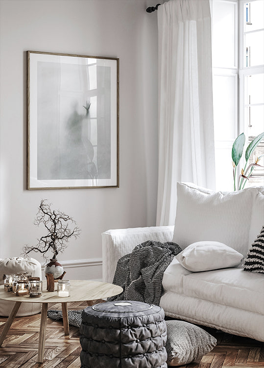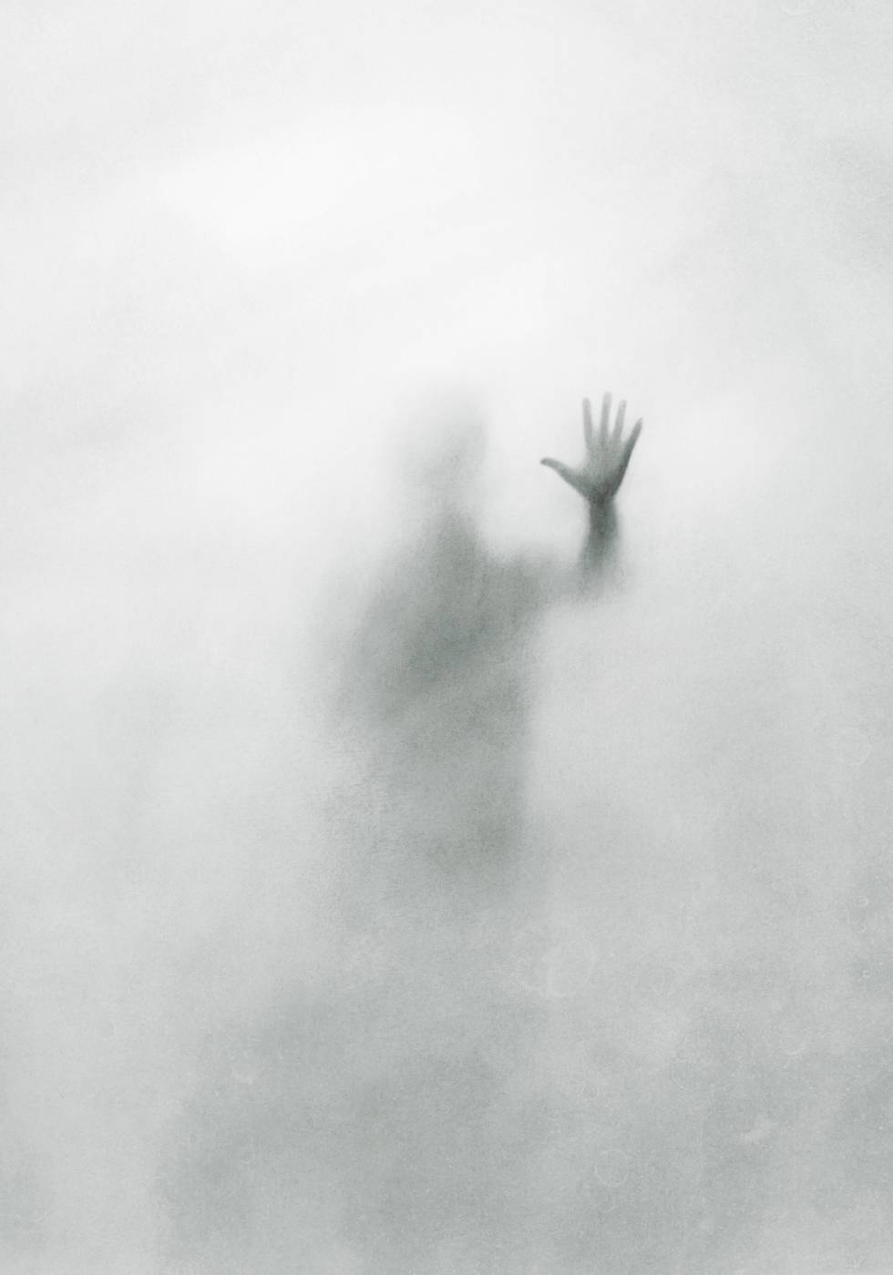 Image floue d'une silhouette humaine, la main appuyée sur une surface brumeuse. Ce motif évocateur et onirique évoque la solitude, la tension et l'incertitude, idéal pour les intérieurs modernes et audacieux.