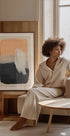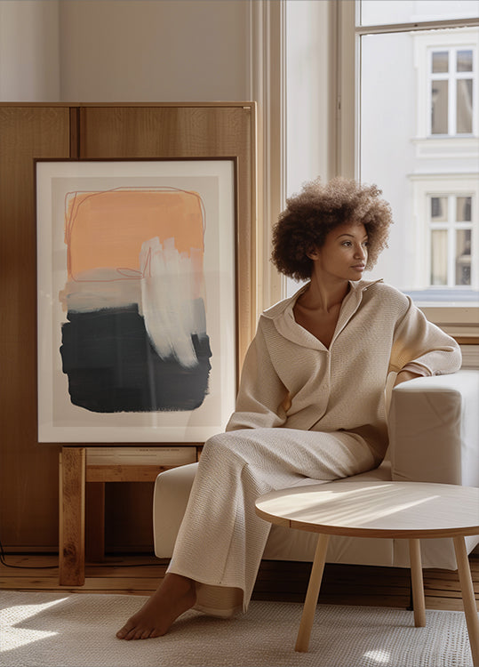 Une affiche abstraite moderne avec des coups de pinceau audacieux en pêche chaude, en couches de gris, de noir profond et une touche de blanc doux. Les traits texturés et les tons contrastés créent une composition saisissante qui équilibre chaleur et profondeur – parfaite pour les intérieurs minimalistes, la décoration scandinave ou les murs de galeries élégants.
