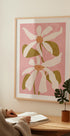 Cette œuvre d'art florale abstraite moderne présente d'élégantes fleurs blanches avec des pétales doux et des feuilles vertes terreuses sur un fond rose pastel chaud. Minimaliste mais expressive, l’œuvre allie beauté botanique et illustration moderne, ajoutant fraîcheur et charme à n’importe quel intérieur.