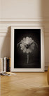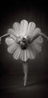 Une photographie poétique en noir et blanc d'une ballerine, où la forme du tutu ressemble à une fleur. Capturée dans une pose gracieuse sur la pointe des pieds, l’image allie élégance, équilibre et symbolisme botanique dans une combinaison onirique de danse et de nature.