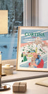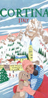 Une affiche de voyage évocatrice célébrant Cortina d'Ampezzo : des sommets alpins enneigés dominent le village animé et une femme souriante au look hivernal élégant, capturée dans une expression graphique et intemporelle. Caroline Bonne Müller allie atmosphère de voyage rétro et charme moderne – parfait pour les rêves d'hiver avec des pastels doux et des contrastes clairs.