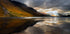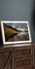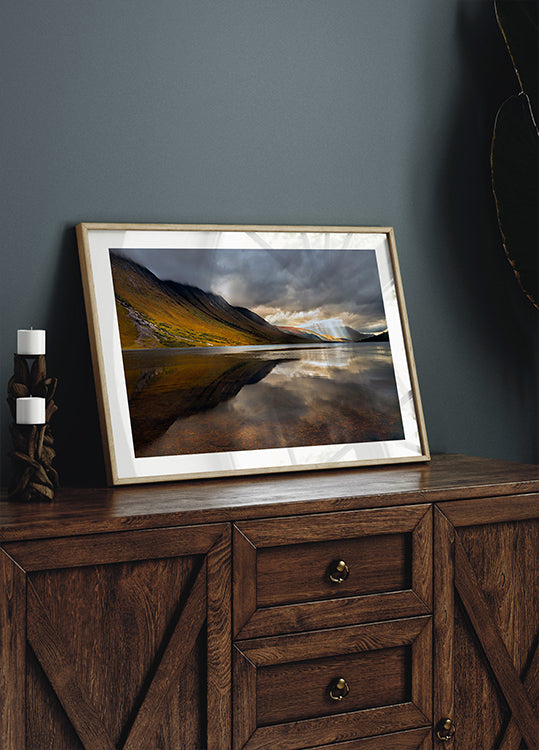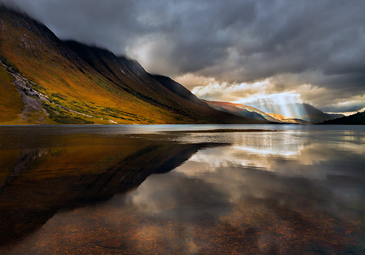 Une superbe affiche de paysage de Glencoe, en Écosse, où des nuages spectaculaires s'ouvrent et des rayons de soleil tombent sur les hautes terres et le lac. L'eau calme reflète les montagnes escarpées et crée une composition puissante mais paisible qui capture l'harmonie et le silence de la nature.