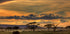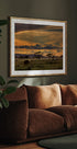 Une affiche époustouflante de la savane africaine au coucher du soleil, avec des ciels dorés, des nuages épars et des acacias dominant majestueusement les plaines brumeuses. Un éléphant broute au premier plan, capturant la beauté brute de la faune et de la nature tanzaniennes. Parfait pour les amoureux de safari et de paysages.
