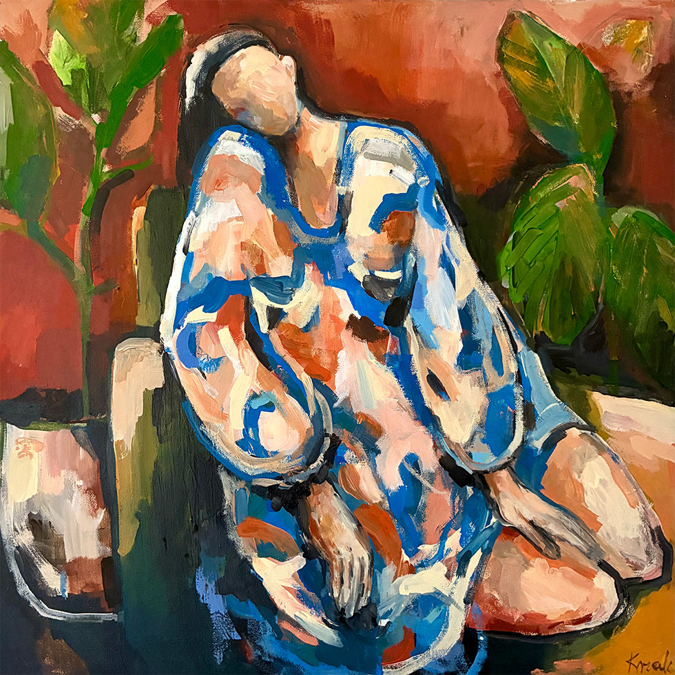 Alice de Magdalena Krzak est un portrait botanique moderne dans des tons bleu profond et vert. Le regard calme de la femme et les coups de pinceau picturaux créent un équilibre harmonieux entre géométrie et nature. Les formes de feuilles encerclent la silhouette et apportent une touche contemplative et élégante à la pièce. Parfait comme pièce maîtresse calme dans le salon, la chambre ou le bureau.