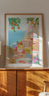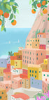 Une illustration colorée de la côte amalfitaine, où les maisons aux couleurs pastel dévalent les falaises vers la mer turquoise. Encadrée par des orangers et des fleurs, l’œuvre capture l’essence de l’été italien : l’architecture ensoleillée, le charme méditerranéen et la joie du voyage et des vacances.