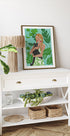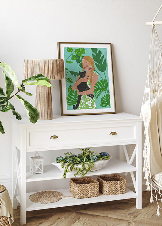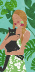 Une illustration vivante d’une femme tenant un chat noir, entourée de feuilles de monstera luxuriantes. Les couleurs fortes et l’esthétique tropicale offrent une expression chaleureuse et moderne, idéale pour les amoureux des chats et les intérieurs botaniques.