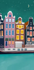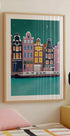 En stemningsfuld illustration af Amsterdam ved nattetid, hvor ikoniske kanalhuse spejler sig i det mørkeblå vand, og små både glider stille forbi under en dyb marineblå himmel. Varmt lys i vinduerne og teal-toner skaber rolig storbypoesi. Skabt af kunstneren Petra Lizde. Et moderne cityscape der fanger rytmen fra kanaler og broer i nattens glød.