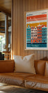 En stilren rejseplakat af Amsterdam: smalle kanalhuse med gavle spejler sig i det stille vand, indrammet af en varm beige baggrund. Grafiske linjer og retro farver skaber en nostalgisk storbystemning, mens typografien med bynavn og koordinater giver et elegant, moderne præg til væggen. Perfekt til hjem eller kontor.