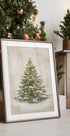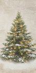 Un arbre à feuilles persistantes de style vintage et confortable est légèrement saupoudré de neige, tandis que de chaudes lumières dorées scintillent entre les branches. Le fond discret à texture de papier et les douces chutes de neige créent une atmosphère de Noël calme et nostalgique, idéale pour un mur de galerie saisonnière classique ou un simple coin d'hiver.