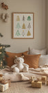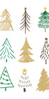 Une illustration minimaliste moderne avec une collection de motifs abstraits d'arbres de Noël en vert, or et marron. Chaque arbre a un style unique dessiné à la main, parfait pour les décorations de Noël et l'art mural festif.