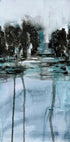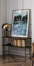Un paysage poétique à l'aquarelle d'Helena Ryhle : des arbres élancés bordent le rivage, leurs silhouettes se reflétant dans l'eau calme. Des tons bleu-gris froids, une légère brume et de doux coups de pinceau créent une atmosphère calme et hivernale avec une touche de mélancolie – parfaite pour un décor nordique moderne. Crée le calme et la profondeur.