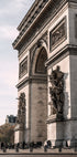 Une impression photographique détaillée de l'Arc de Triomphe à Paris, montrant les sculptures monumentales, les inscriptions et le design néoclassique. Capturée depuis le niveau de la rue avec des gens au pied, l'œuvre d'art met en valeur à la fois la grandeur du monument et sa place dans la vie quotidienne de la ville.