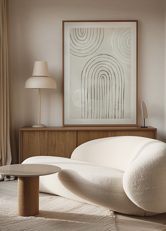 Une affiche abstraite dessinée à la main avec des lignes courbes organiques et des motifs circulaires dans des tons beiges doux. La géométrie imparfaite et fluide ajoute de la chaleur et de la texture et donne à l’œuvre une touche naturelle et artistique. Parfait pour les intérieurs minimalistes d’inspiration japonaise et scandinave.