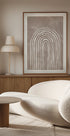 Une affiche abstraite minimaliste avec des lignes arquées dessinées à la main en blanc éclatant sur un fond texturé beige doux. La géométrie organique et les tons de couleurs neutres offrent un équilibre apaisant, idéal pour les intérieurs Japandi, scandinaves ou minimalistes modernes.