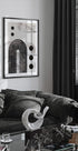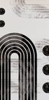 Une affiche abstraite saisissante avec des arcs noirs audacieux, des formes circulaires et des lignes géométriques superposées sur un fond légèrement texturé. La palette monochrome met l'accent sur la symétrie et l'équilibre, ce qui en fait une déclaration élégante dans les intérieurs modernes, d'inspiration japonaise ou scandinave.