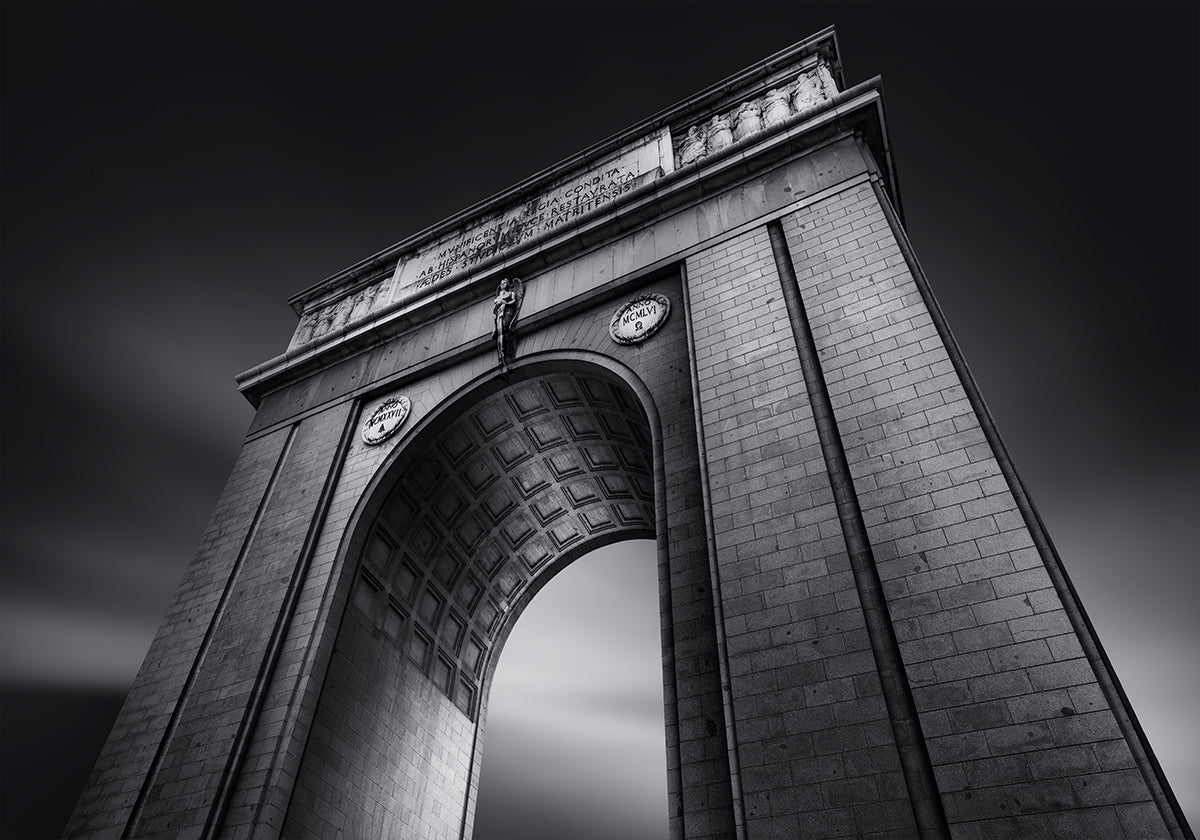 Le photographe Jorge Ruiz Dueso encadre un arc de triomphe monumental en noir et blanc saisissant, en utilisant une perspective audacieuse en contre-plongée pour magnifier sa puissance. De fins détails de pierre, des contrastes nets et des lignes directrices vous guident à travers le portail, évoquant le rythme historique de Madrid et le romantisme de l'Europe. Une ode raffinée au patrimoine urbain.