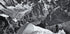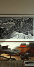 Une superbe photographie en noir et blanc d'un alpiniste debout sur une étroite crête de neige dans les Alpes françaises. La vue spectaculaire capture des sommets déchiquetés, des vallées profondes et des glaciers s'étendant jusqu'à l'horizon. Un hommage fort à l’aventure, à l’endurance et à la beauté des paysages alpins.