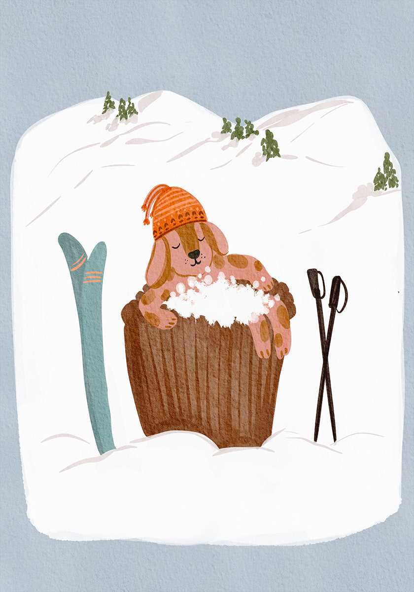 Un motif hivernal ludique de Nikita Jariwala : un adorable chien brun profite d'un bain bouillonnant au milieu des montagnes enneigées et des pins vert foncé. Les bulles dansent dans l’air froid tandis que les petits skieurs dévalent les pentes en arrière-plan. Une charmante aquarelle qui réchauffe le cœur. Parfait pour apporter de l'humour et de la magie hivernale dans la maison.