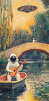 Une peinture de style impressionniste surréaliste représentant des astronautes dans un paysage terrestre. Un astronaute est assis dans un bateau et joue de la guitare tandis qu'un autre fait des gestes depuis un pont de pierre sous un ciel doré. Au-dessus d'eux plane un OVNI qui mêle science-fiction et histoire de l'art dans une scène humoristique et imaginative.