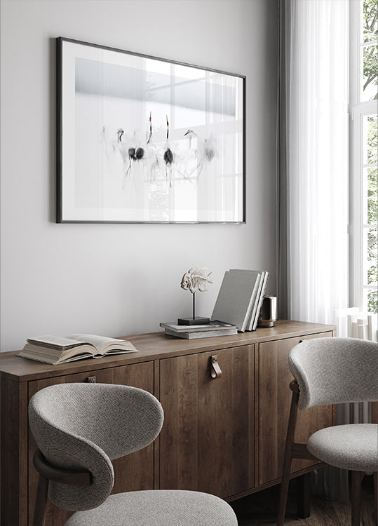 La danse gracieuse de deux grues rouges s'élève à travers un paysage enneigé, capturée dans une expression calligraphique très lumineuse de Larry Deng APA. Les traits doux comme de l'encre et l'espace minimaliste créent le calme, le mouvement et la poésie – comme le vent d'hiver sur le papier – un hommage discret à l'élégance japonaise et au rythme de la nature. Un look poétique pour votre espace.