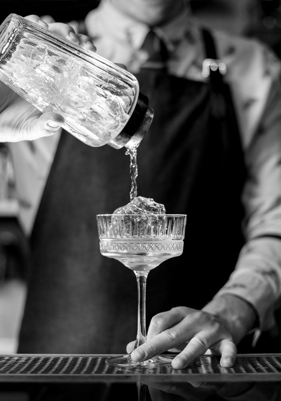 Une photographie élégante en noir et blanc montrant un barman versant un cocktail dans un verre coupé classique. La glace scintille au fur et à mesure que le liquide coule, créant une scène de mixologie intemporelle. Parfait pour la décoration de bar, les amateurs de cocktails ou ceux qui apprécient l'art du barman.