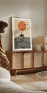 Une illustration minimaliste d’une silhouette solitaire dans un petit bateau flottant sur des vagues noires gonflées sous un soleil orange vif. Les lignes épurées et les tons chauds créent une ambiance calme et réfléchie — une pièce idéale pour les espaces modernes qui embrassent le calme et la simplicité.