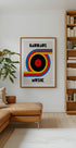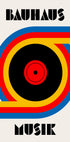 Une affiche musicale audacieuse inspirée du Bauhaus présentant un disque vinyle noir stylisé avec des lignes géométriques dynamiques rouges, jaunes et bleues. Cette œuvre d'art rétro-moderne célèbre la musique, le rythme et le design dans l'esprit du minimalisme du Bauhaus. Art mural parfait pour les mélomanes, les collectionneurs de disques et les intérieurs modernes.