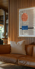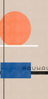 Une affiche minimaliste inspirée du Bauhaus avec des formes géométriques audacieuses, dont un grand cercle orange et un rectangle bleu audacieux sur fond beige. Des lignes droites et des contrastes simples font de cette œuvre d’art un élément intemporel dans les intérieurs modernes et vintage.