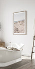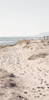 Une photographie côtière sereine montrant un chemin sablonneux menant à la mer. Les douces empreintes de pas dans le sable, les herbes sauvages des plages et les vagues de la mer au loin créent une atmosphère calme et nostalgique. Parfait pour apporter la tranquillité estivale dans n’importe quelle pièce.