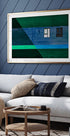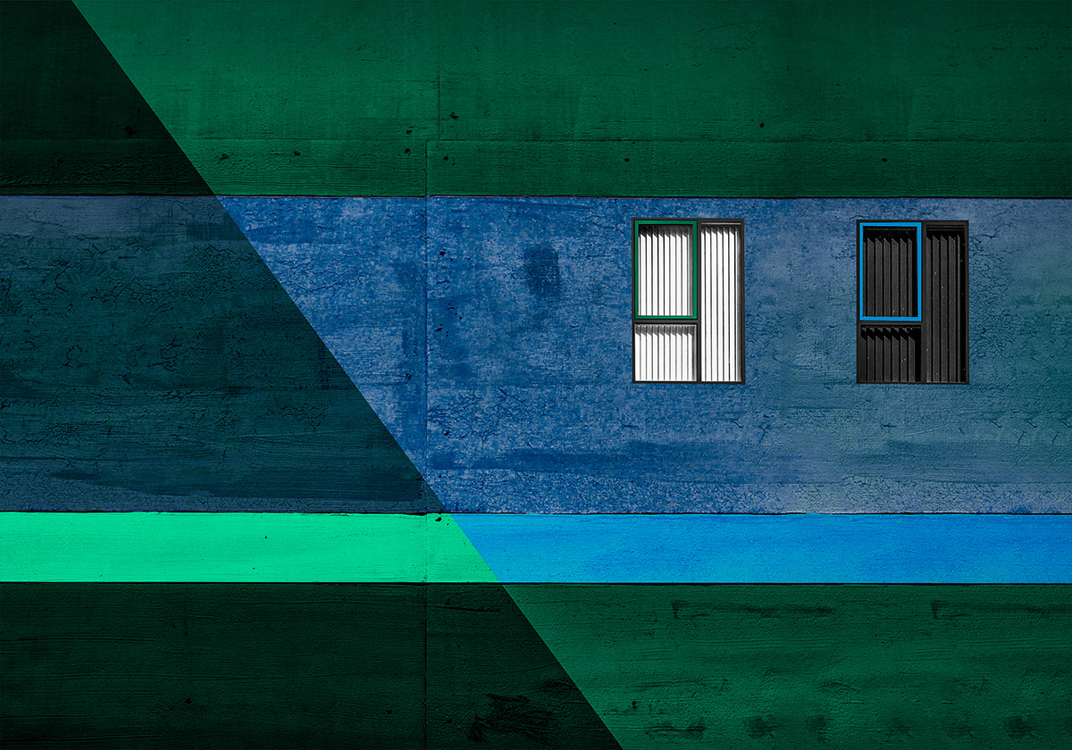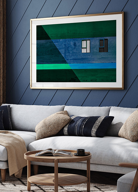 Une œuvre d'art architecturale audacieuse avec deux fenêtres dotées de stores noirs et blancs audacieux, adossé à un mur texturé aux bleus et verts profonds. Les lignes nettes et la composition géométrique créent une œuvre abstraite moderne pleine d'équilibre, de contraste et d'excitation visuelle.