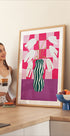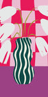 Une nature morte florale audacieuse et ludique avec une touche rétro-moderne. Le vase rayé et les fleurs blanches abstraites se dressent sur un fond à carreaux rose vif, offrant un joyeux mélange de couleurs, d'humour et de graphisme.