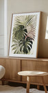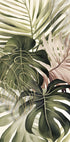 Une composition botanique élégante avec des feuilles tropicales luxuriantes dans des tons vert doux avec des touches de détails roses et dorés. Le design combine des feuilles de palmier exotiques et du monstera pour un look moderne d'inspiration bohème, parfait pour ajouter de la fraîcheur et de l'élégance à n'importe quel décor.