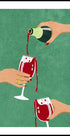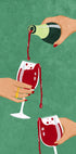 Une illustration colorée de mains versant du vin rouge dans des verres, où le vin déborde de manière ludique et festive. Avec des couleurs vives et des détails élégants, la pièce capture la joie des réunions, des cocktails et des moments partagés et devient un élément chic et vivant dans les intérieurs modernes.