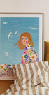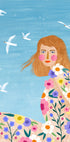 Une illustration fantaisiste et colorée d’une femme enveloppée dans une cape fleurie sur un ciel bleu clair. Entourée d'oiseaux volants, l'œuvre évoque la liberté, la joie et l'esprit frais du printemps. Légendaire, mais aussi calme, il allie nature et fantaisie dans un style moderne et vivant.