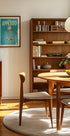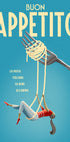Une affiche colorée et ludique d'inspiration italienne, présentant une illustration d'une femme se balançant sur des fils de pâtes enroulés autour d'une fourchette. Avec le texte frappant Bon appétit il célèbre la joie de la cuisine italienne et son réconfort émouvant, un mélange d'humour et de style dans une œuvre d'art accrocheuse.