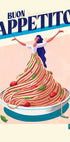 Une affiche joyeuse et ludique d'inspiration italienne avec la phrase frappante Bon appétit. Il montre une femme dont la robe coule sur une montagne de spaghettis aux tomates et au basilic, un mélange humoristique de culture culinaire et d'illustration dans une œuvre d'art vivante.