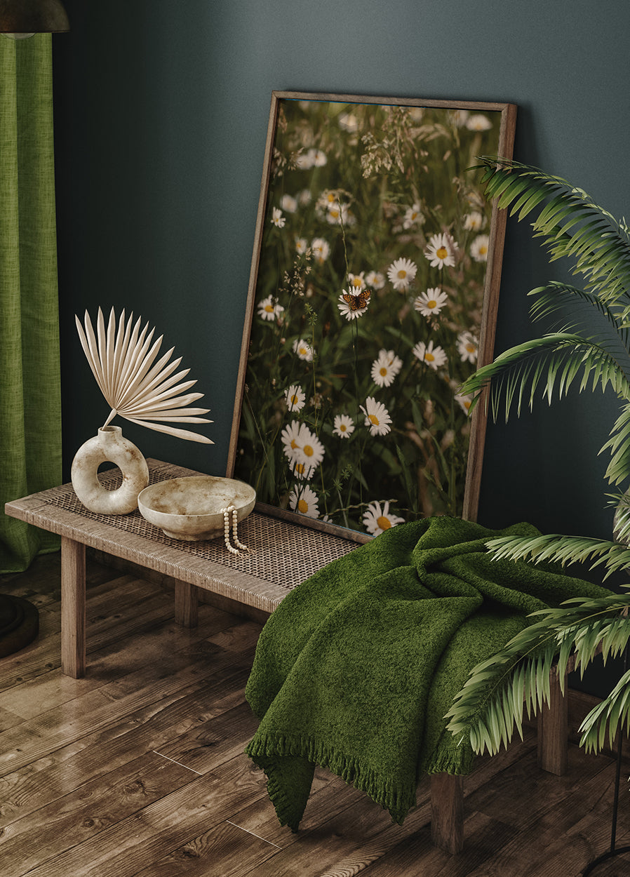 Une affiche délicate et moderne ornée d'un motif de fleurs de camomille et d'un papillon. Idéale pour créer une atmosphère calme et naturelle dans n'importe quelle pièce, à la maison comme au bureau.