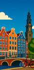 Rêvez à Amsterdam avec cette illustration saturée de couleurs représentant un vélo au bord d'un canal tranquille, entouré d'arbres et de maisons à pignons emblématiques. Les rayons du soleil se reflètent dans l'eau alors que le style de voyage rétro rencontre le minimalisme moderne. Une œuvre évocatrice de Taudalpoi, parfaite pour les amoureux de la ville. Un hommage à l’envie de voyager, à la nostalgie et à la poésie des couleurs nordiques.