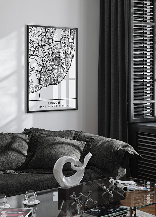 Black Maps 39 est l'élégant hommage d'Emiliano Deificus à Lisbonne : une composition de plan de ville monochrome où les rues, les quartiers et les lignes de rivières dessinent un rythme géométrique net. Le contraste souligne la précision des coordonnées et le dynamisme de la ville et crée une expression graphique et moderne pour la maison urbaine. Parfait pour une décoration minimaliste.