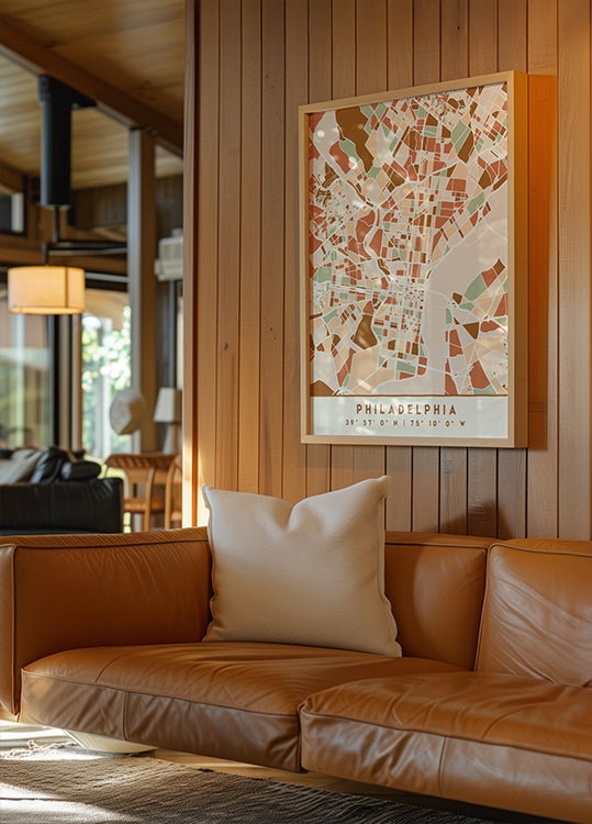 Black Maps Earth Tones 65 d'Emiliano Deificus combine une grille détaillée des rues de Philadelphie avec des teintes profondes et terreuses. Les lignes noires dessinent la structure vibrante de la ville, tandis que les tons chauds créent un contraste calme. Une affiche graphique et moderne qui élève le salon et le bureau avec une élégance urbaine. Parfait pour une esthétique simple et nordique.