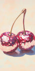 Une œuvre d'art ludique et imaginative de deux cerises transformées en boules disco scintillantes. Avec des couleurs vibrantes, des reflets brillants et un style pictural, cette œuvre combine le surréalisme et la nature morte d'une manière moderne et fantaisiste qui ajoute de l'énergie et du plaisir à n'importe quelle pièce.