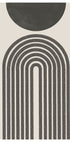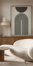 Un imprimé abstrait minimaliste inspiré du style du milieu du siècle avec des arcs noirs audacieux qui s'étendent vers un cercle noir uni. La simplicité géométrique des lignes et l’équilibre circulaire font de cette œuvre d’art une pièce accrocheuse de décoration murale moderne.