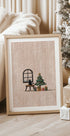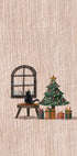 Une charmante œuvre d'art inspirée de la broderie représentant un chat noir assis près d'une fenêtre donnant sur la neige. Un sapin de Noël décoré de cadeaux crée du confort et une atmosphère de Noël, parfait comme décoration de Noël pour la maison.