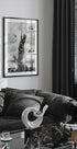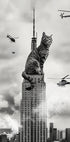 Une œuvre surréaliste et humoristique représentant un chat géant au sommet de l'Empire State Building, entouré d'hélicoptères dans une parodie inspirée de King Kong. Ce paysage urbain en noir et blanc est parfait pour les amoureux des chats et les fans de décoration urbaine amusante.