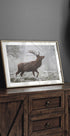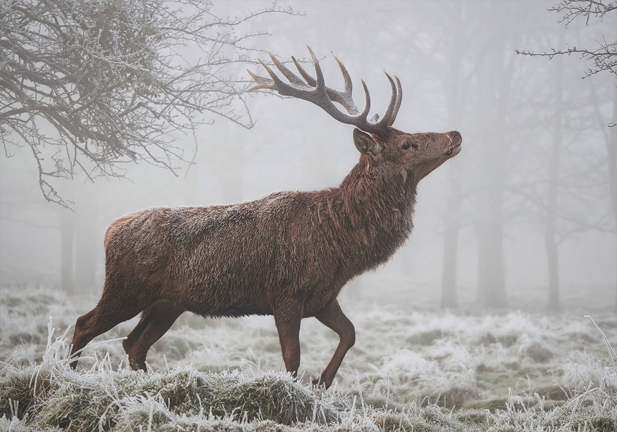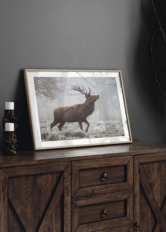 Un cerf majestueux se dresse par un matin glacial d'hiver, la vapeur flotte dans l'air et la pâle lumière du soleil dessine la silhouette de puissants bois. Les tons froids et l'atmosphère calme confèrent à la pièce calme nordique et élégance naturelle. Art photographique de Cristian Vasile, créé pour le salon, la chambre ou le bureau. Un hommage silencieux aux animaux sauvages.
