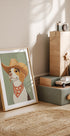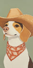 Une œuvre d'art ludique et charmante représentant un chien beagle habillé en cowboy, avec un large chapeau et un bandana à motifs. Ce portrait animalier humoristique combine le style occidental rustique avec un humour léger – parfait pour les amoureux des chiens et les collections d’art mural fantaisistes.