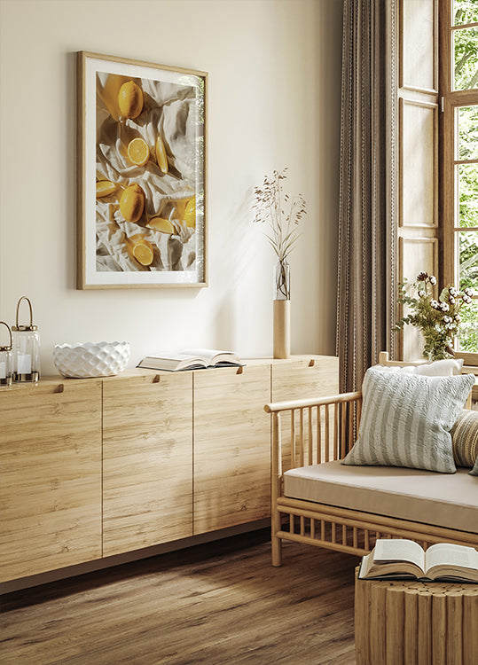 Une nature morte artistique de citrons jaune vif, dont certains coupés en tranches, joliment disposés sur un tissu blanc texturé. La lumière du soleil pénètre à flots, projetant des ombres dynamiques qui soulignent le contraste entre la douceur du tissu et l'éclat des écorces de citron. Idéal pour créer une atmosphère fraîche et vivifiante dans une cuisine ou une salle à manger.