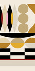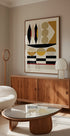 Une affiche abstraite distinctive inspirée du Bauhaus avec des formes géométriques dans des tons terre tels que l'ocre, le beige et le noir, complétées par des accents rouges et roses. Les formes épurées et structurées créent un équilibre visuel saisissant qui allie le minimalisme moderne au design du milieu du siècle, parfait pour les intérieurs contemporains ou les murs de galerie d'inspiration rétro.